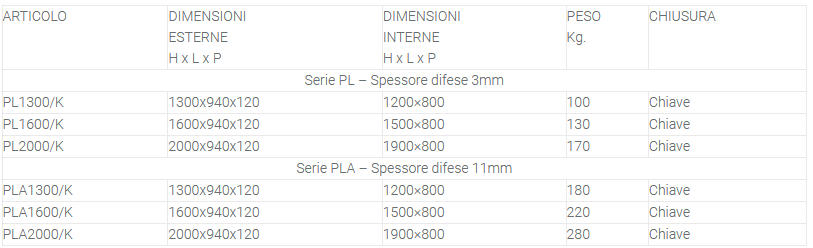 Le porte di sicurezza per caveaux leggere “PL” – “PLA” sono state progettate per la realizzazione di piccoli vani caveaux in ambito civile e commerciale. La creazione di piccole camere di sicurezza risulta molto utile per proteggere beni voluminosi. Grazie alla realizzazione a misura possono essere integrate in vani preesistenti senza gravose opere murarie. Serie “PL” Anta e telaio realizzati con lamiera di acciaio spessore 3 mm. Ulteriore piastra in acciaio al manganese spessore 2 mm a protezione delle serrature. Serie “PLA” Anta e telaio realizzati con lamiera di acciaio spessore 3 mm. Protezione interna su tutta l’anta con lamiera di acciaio spessore 8 mm. Ulteriore piastra in acciaio al manganese spessore 2 mm a protezione delle serrature. Battente con apertura a 180° con cardini esterni di serie sulla destra. Movimento di chiusura azionato da maniglia che comanda lame in acciaio su due lati, antistrappo continuo lato cardini. Riferma diretta ai meccanismi con serrature certificate VDS. Soglia piana sul fondo altezza 30 mm. Anti segregazione con pomoli e maniglia interna. Colore grigio Ral 7016 effetto bucciato.