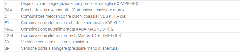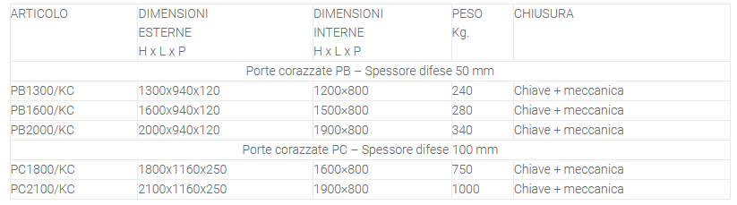 Grazie alla robustezza dei materiali impiegati e alle tecnologie di ultima generazione con le quali sono realizzate, le porte caveau sono in grado di opporre un’adeguata resistenza contro i tentativi di scasso e furto e di contrastare in maniera efficace eventuali attacchi sia meccanici che termici. Le porte corazzate “PB” – “PC” sono state progettate per la realizzazione di vani caveaux in ambito civile e commerciale. I modelli proposti trovano ottima applicazione per Banche, gioiellerie e ovunque necessita di alta protezione antiscasso. Grazie alla realizzazione a misura possono essere integrate in vani preesistenti senza gravose opere murarie. Serie “PB” Anta e telaio realizzati con lamiera di acciaio spessore 3 mm. Protezione anta con fusione di cemento speciale ad alta densità spessore 45 mm. Totale difese 50 mm. Ulteriore piastra in acciaio al manganese spessore 2 mm a protezione delle serrature. Serie “PC” Anta e telaio realizzati con lamiera di acciaio spessore 3 mm. Protezione anta con fusione di cemento speciale ad alta densità spessore 70 mm e fusione acciaio corindone spessore 25 mm. Totale difese 100 mm. Ulteriore piastra in acciaio al manganese spessore 2 mm a protezione delle serrature. Battente con apertura a 180° con cardini esterni di serie sulla destra. Movimento di chiusura azionato da volante che comanda lame in acciaio su più lati, antistrappo continuo lato cardini. Riferma diretta ai meccanismi con serrature certificate VDS. Antisegregazione con pomoli e maniglia interna. Colore grigio scuro Ral 7016 effetto bucciato.